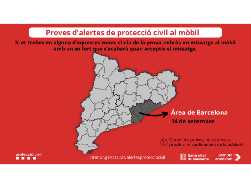 Durant les proves no es preveu practicar el confinament dels centres, només cal comprovar que rebeu l’alerta als vostres telèfons mòbils ( prèviament s’ha d’activar l’opció “Alertes d’emergència” dels telèfons mòbils).