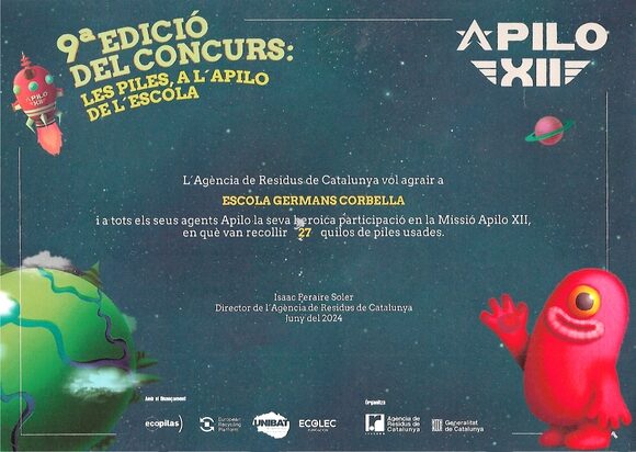 Us volem informar que la l’Agència de Residus de Catalunya ens va agrair a l’Escola Germans Corbella i a tots els seus agents Apilo, doncs el curs passat, en la