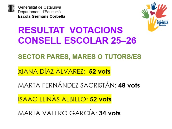 Us comuniquem el resultat de les votacions del sector famílies de les vostres representants al Consell Escolar: