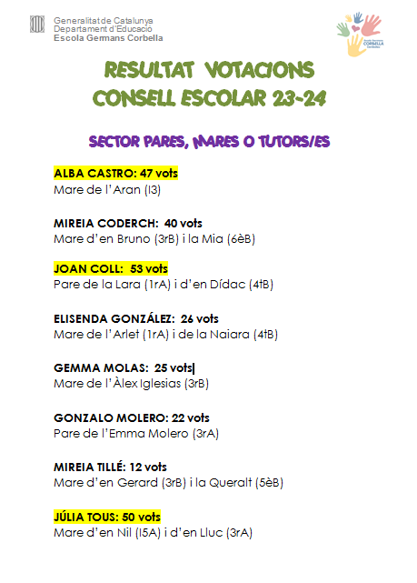 Resultats Eleccions al Consell Escolar 23-24Per admin / 21 de novembre de 2023 / 1r 2n 3r 4t 5è 6è General I3 I4 I5 Infantil Portada Primària / Consell Escolar, eleccions, Promoció 23-24 Benvolgudes famílies, Us comuniquem el resultat de les votacions del sector famílies de les vostres representants al Consell Escolar: Moltes gràcies a tots/es les participants i a totes les famílies que heu vingut a votar!