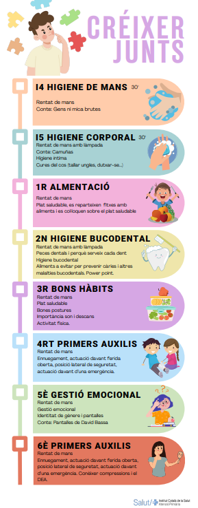 Els dies 18 i 25 de març, els nens i nenes d’I4, I5, 1r, 2n i 4t  participaran en tallers adaptats a cada edat, guiats per professionals sanitaris. L’alumnat de 3r, 5è i 6è realitzaran els tallers més endavant.