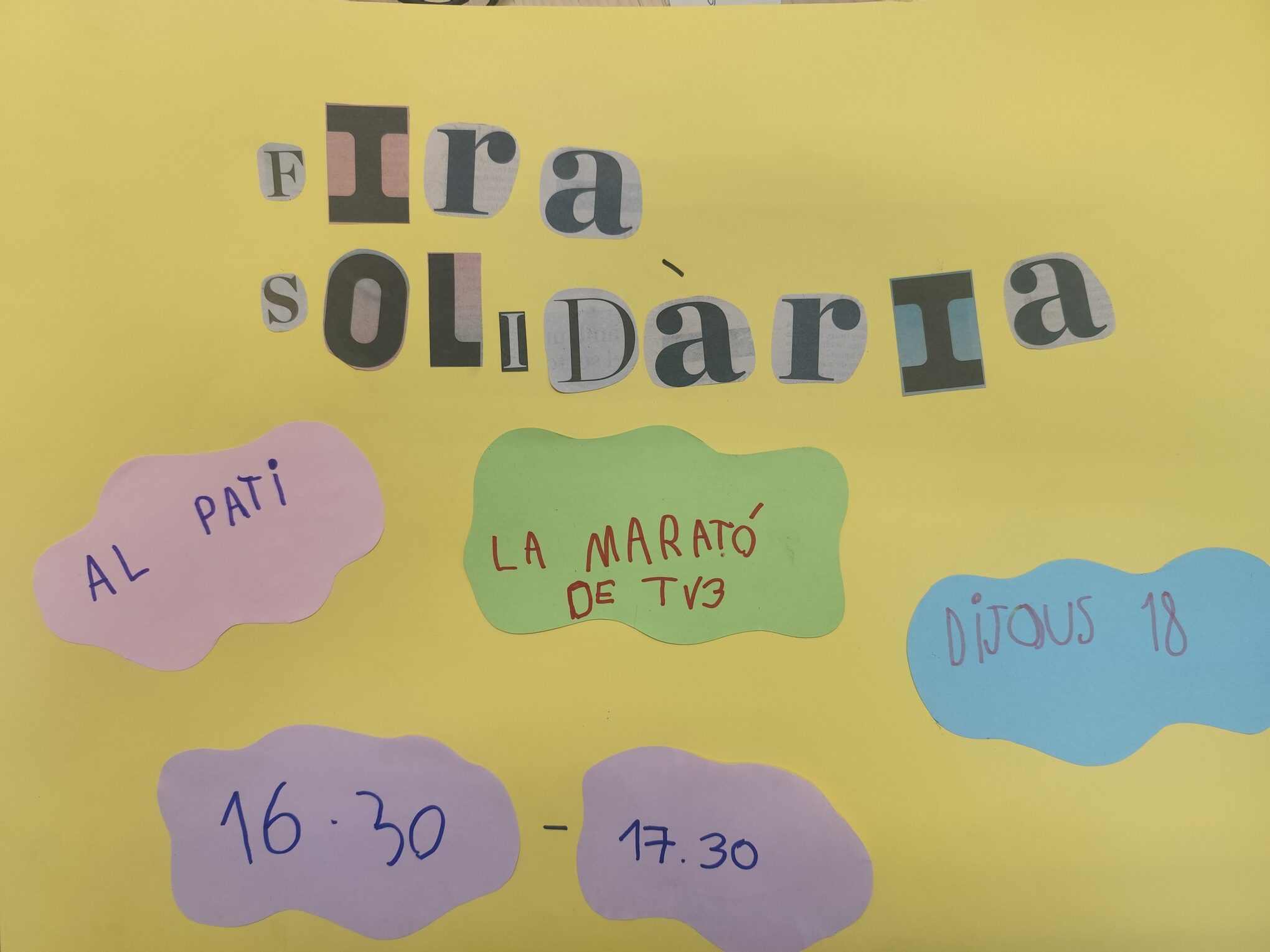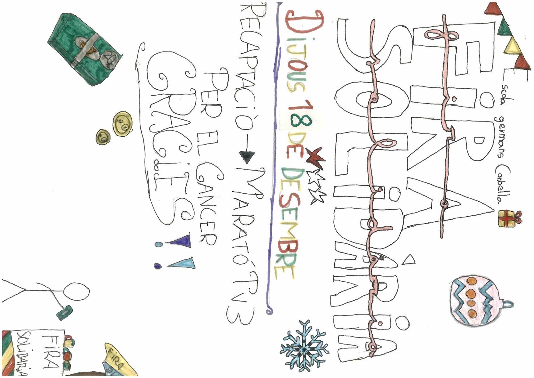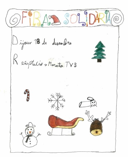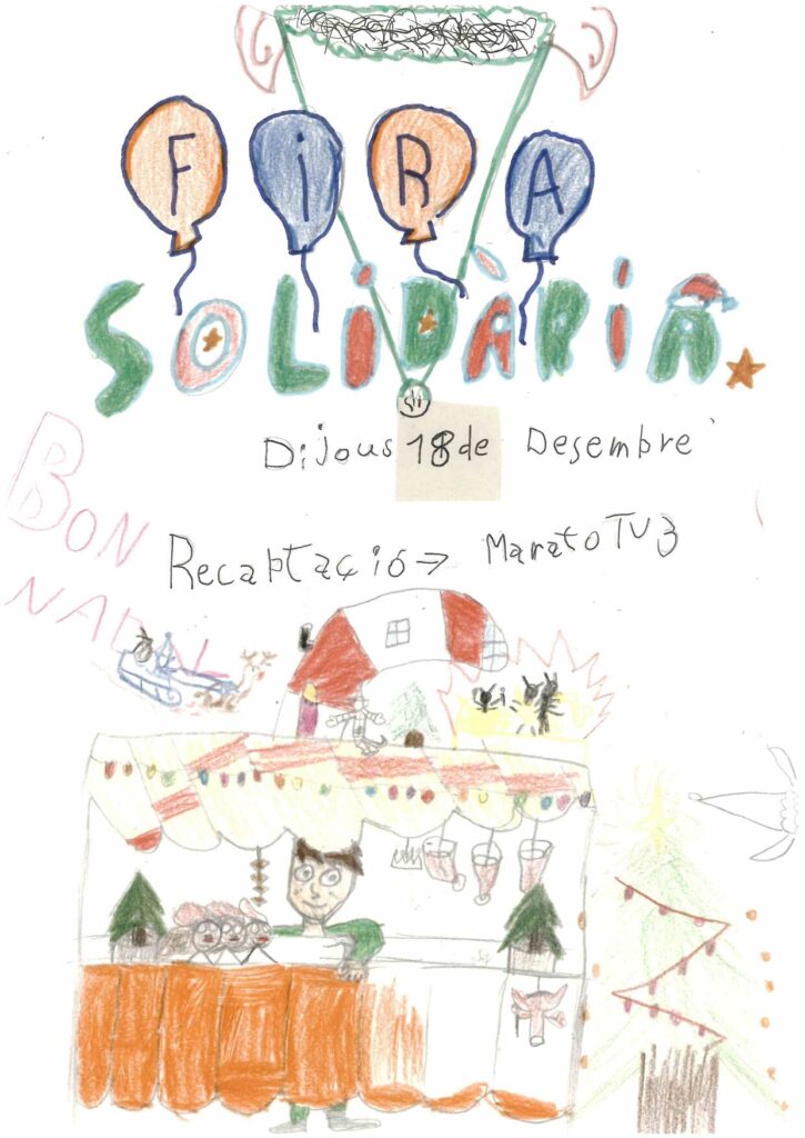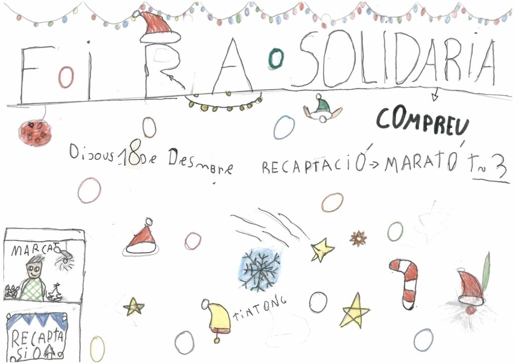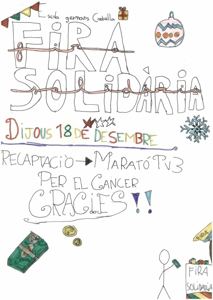 XXVIII Fira de NadalPer admin / 18 de desembre de 2025 / 1r 2n 3r 4t 5è 6è Altres activitats General I3 I4 I5 Infantil Portada Primària / Fira de Nadal, Fira de solidaritat, solidaritat Benvolgudes famílies, Avui 18 de desembre de 16:30 a 17:30 hi haurà la XXVIII Fira solidària i enguany la recaptació serà per la marató de TV3 -Càncer. Moltes gràcies als infants de 3rA per elaborar uns cartells informatius tant bonics.