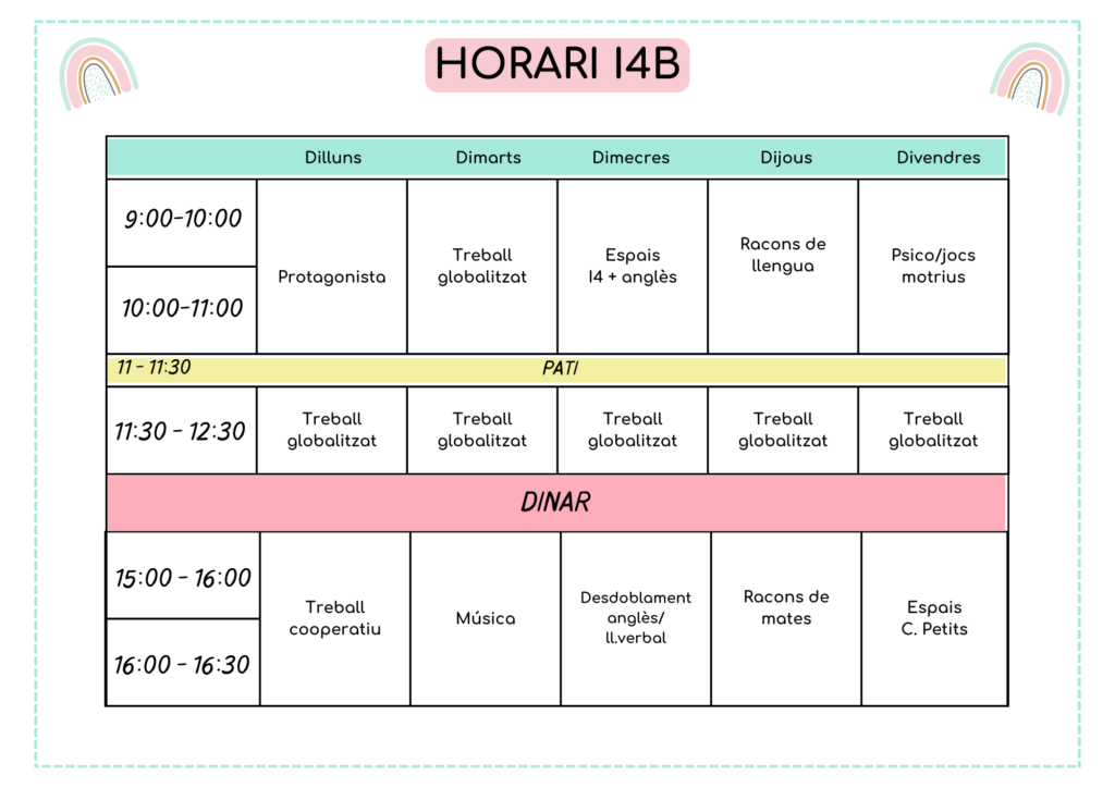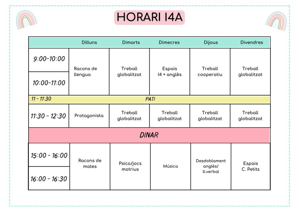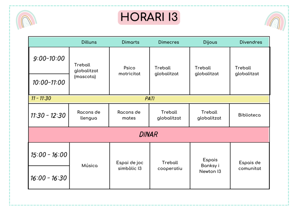 Per l’alumnat que inicia l’escolarització a I3, organitzem un breu període d’adaptació que suposa una certa modificació dels horaris de la primera setmana de classe, i que es fa saber a les famílies en les reunions prèvies corresponents.