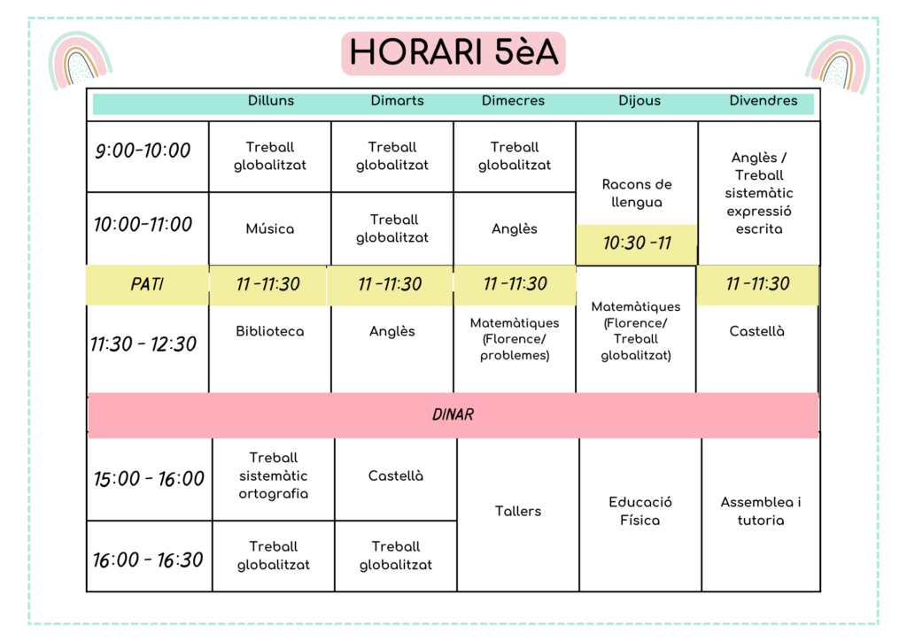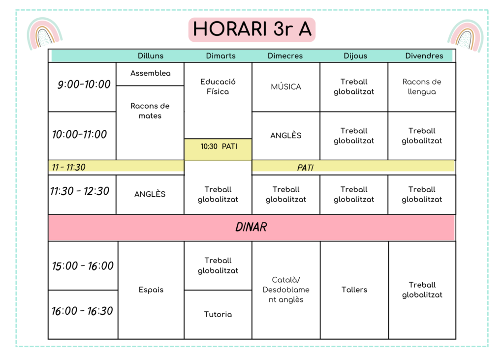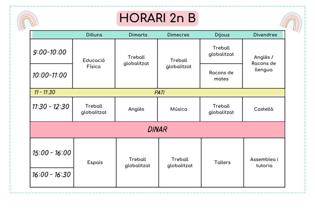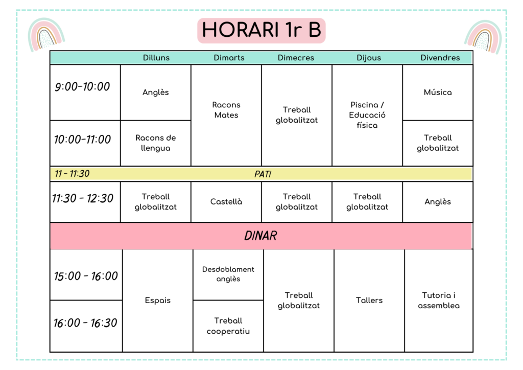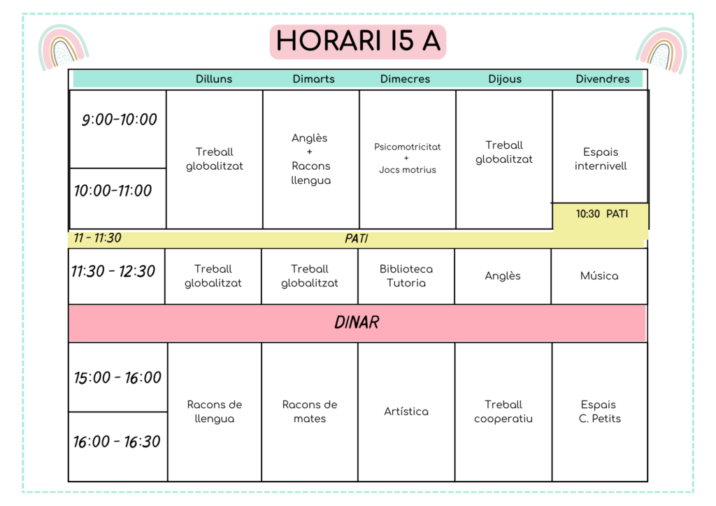 L’horari lectiu del centre és de 9:00h a 12:30h i de 15:00h a 16:30h.