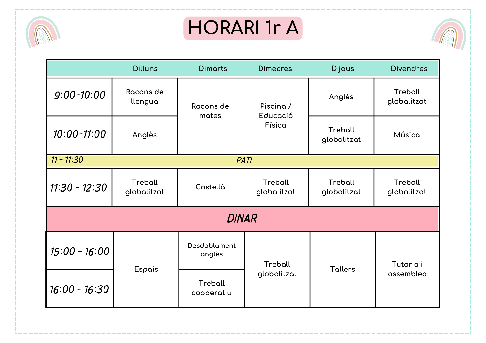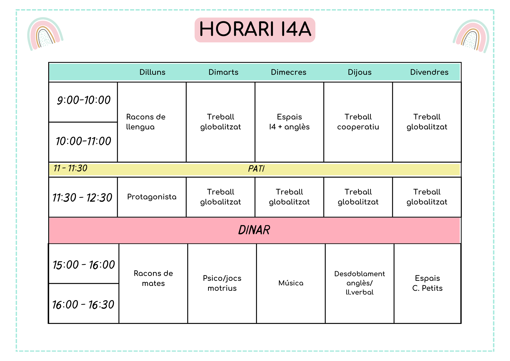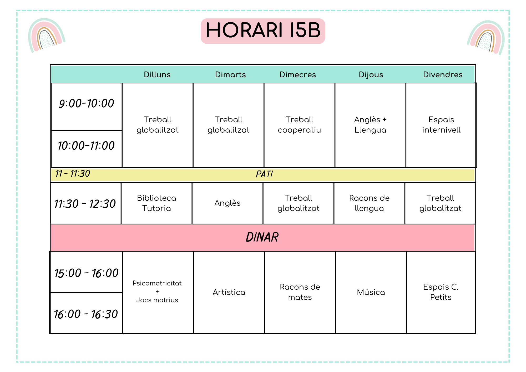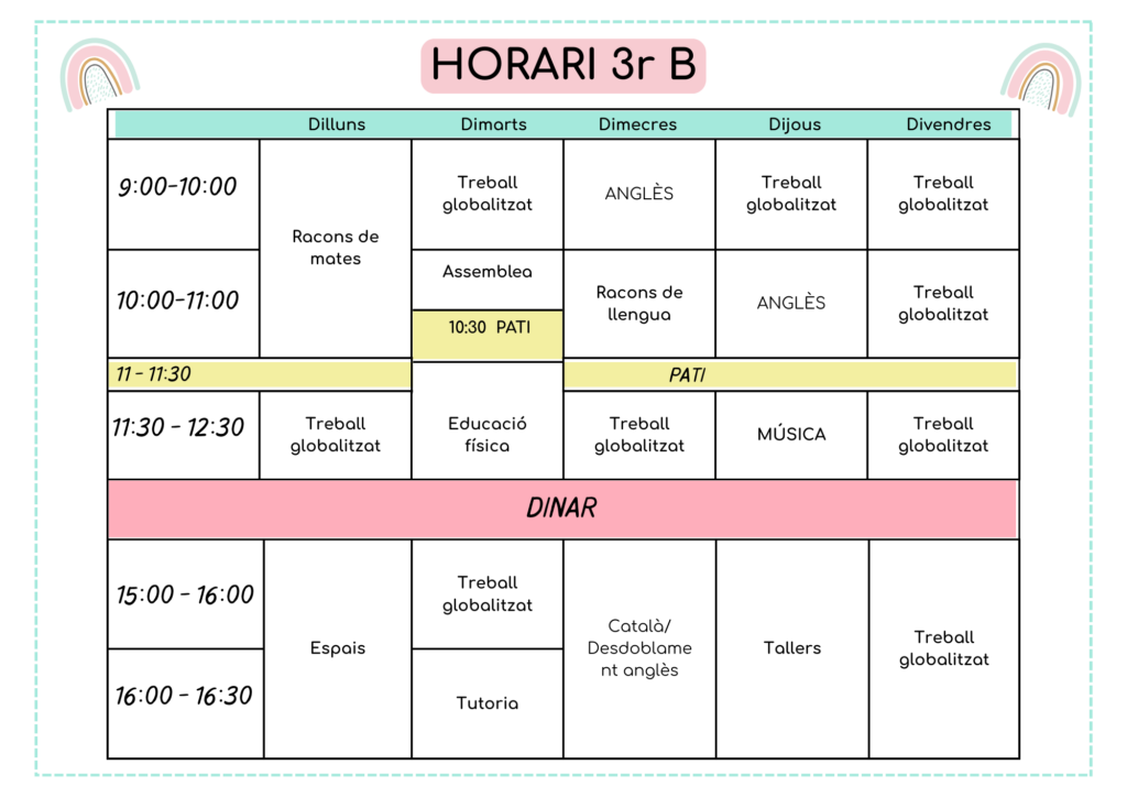 L’horari lectiu del centre és de 9:00h a 12:30h i de 15:00h a 16:30h.