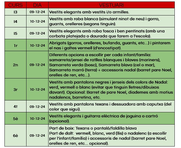 Benvolgudes famílies, Ben aviat, com cada curs, començarem a enregistrar el vídeo de Nadal amb els vostres fills/es des de I3 fins a 6è. Us avancem que novament us l’oferirem en format digital a la Fira de Nadal. Per tal de dur-ho a terme, necessitem que els infants vagin vestits com indiquem els dies 9