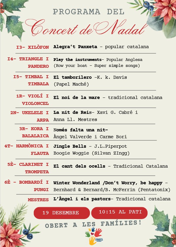 Benvolgudes famílies, Us fem arribar algunes informacions d’interès: Concert de Nadal: En principi, el concert de Nadal es manté tal com estava previst i es durà a terme a les 10.30 h al porxo del pati de l’escola. Les portes de l’avinguda Diumé s’obriran 10 minuts abans de l’inici del concert per facilitar l’accés. Segons