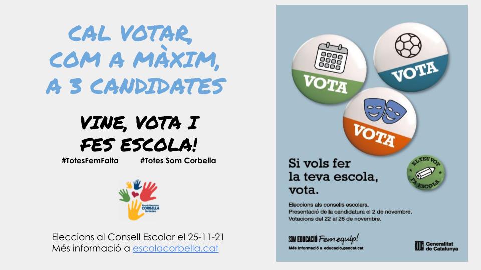 Benvolgudes famílies, Perquè algú de la vostra confiança us representi! Per aportar i defensar les vostres idees! Us animem a participar a les eleccions de demà dia 25-11-21 de 8:30h a 9:30h i de 16:15h a 18:15h al vestíbul de l’escola (penseu a portar el DNI o el NIE) Assemblea de delegats i delegades de