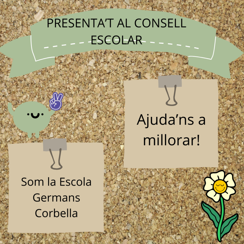 Estimades famílies, Per al consell escolar del sector famílies cal escollir 3 representants. Us animem, doncs, a presentar-vos omplint aquest document candidatures i que ho porteu a secretaria o a la direcció del centre. Teniu fins aquest dimecres!! Aquests cartells els han fet els nens i nenes de 5è en equips cooperatius #TotsSomCorbella#
