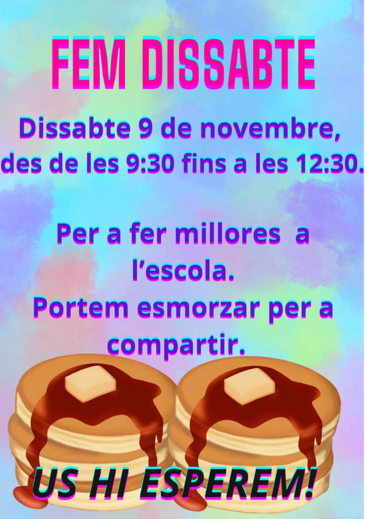 Benvolgudes famílies, Us recordem que pròxim 7 de febrer farem un “Fem dissabte”. Us animem a participar en aquesta nova jornada de treball col·laboratiu. Ens trobarem de 9:30 h a 13:30 h per a fer millores a la nostra escola. A mig matí farem una aturada per compartir l’esmorzar que cadascú durà de casa seva. L’escola posarà […]