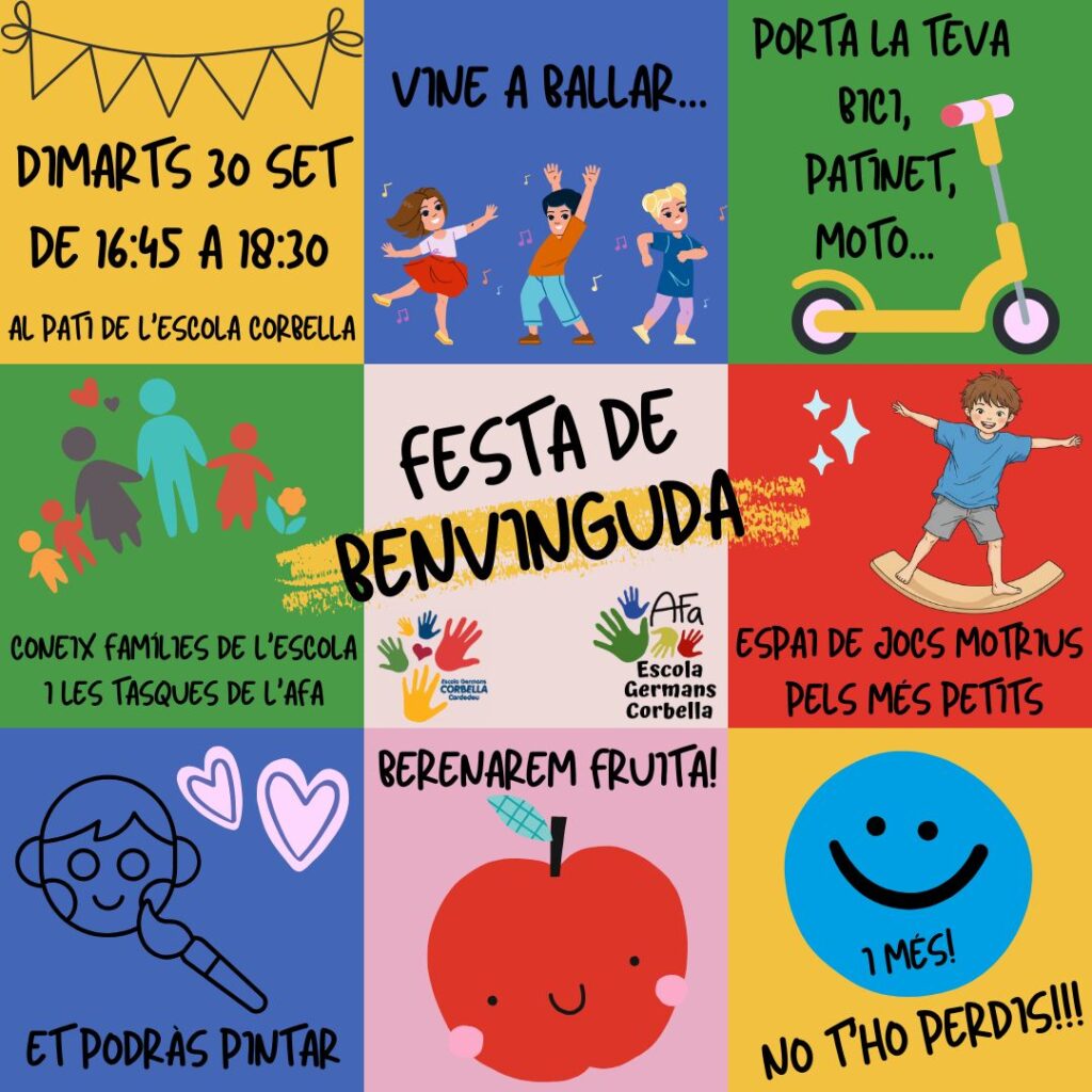 Benvolgudes famílies, Esteu tots i totes convidades a venir a la Festa de benvinguda al pati de l’escola. Necessitem famílies per preparar, acompanyar en els diferents espais de joc i maquillar. Si tens disponibilitat aquella tarda per col·laborar, fes-ho saber a la delegada del teu grup, Moltes gràcies!! #SomCorbella