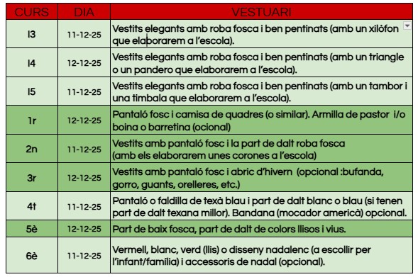 Benvolgudes famílies, Ben aviat, com cada curs, començarem a enregistrar el vídeo de Nadal amb els vostres fills/es des de I3 fins a 6è. Us avancem que novament us l’oferirem en format digital a la Fira de Nadal. Per tal de dur-ho a terme, necessitem que els infants vagin vestits com indiquem els dijous 11