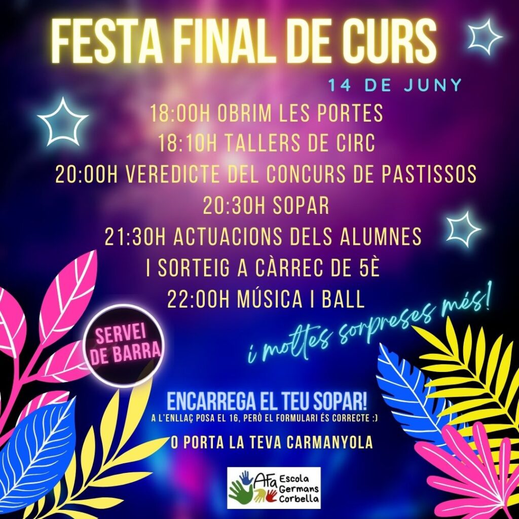 Benvolgudes famílies, S’acosta el final de curs i l’AFA ens està preparant una festassa! Animeu-vos a participar-hi. Podeu comprar els tiquets del sopar per tenir una previsió. Si no heu fet reserva del sopar, podeu igualment venir amb el menjar fet a casa. La barra i la gestió del sopar serà per a recollir fons