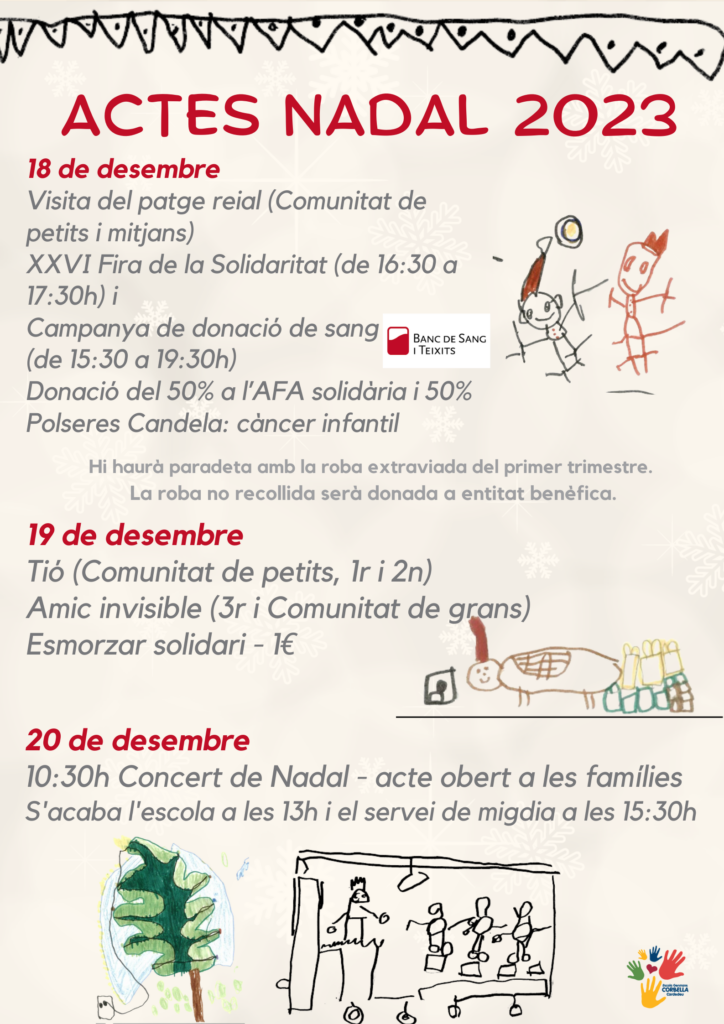 Benvolgudes famílies, Ja tenim aquí el Nadal aquí teniu el programa d’actes del centre: La donació d’aquest curs anirà destinada a l’AFA solidària i al càncer infantil: Polseres Candela Moltes gràcies i seguim fent créixer el Corbella conjuntament.