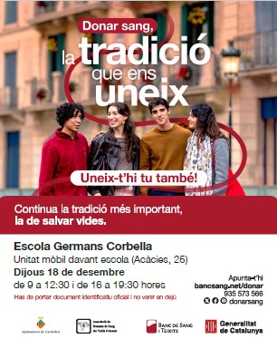 Benvolgudes famílies, Us informem que el dijous 18 de desembre, coincidint amb la Fira de la Solidaritat, tindrem a l’escola Germans Corbella una campanya de donació de sang. L’horari serà de 9 a 13 h i de 16 a 20 h, i es realitzarà a la unitat mòbil situada davant de l’escola. Recordeu portar un […]