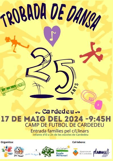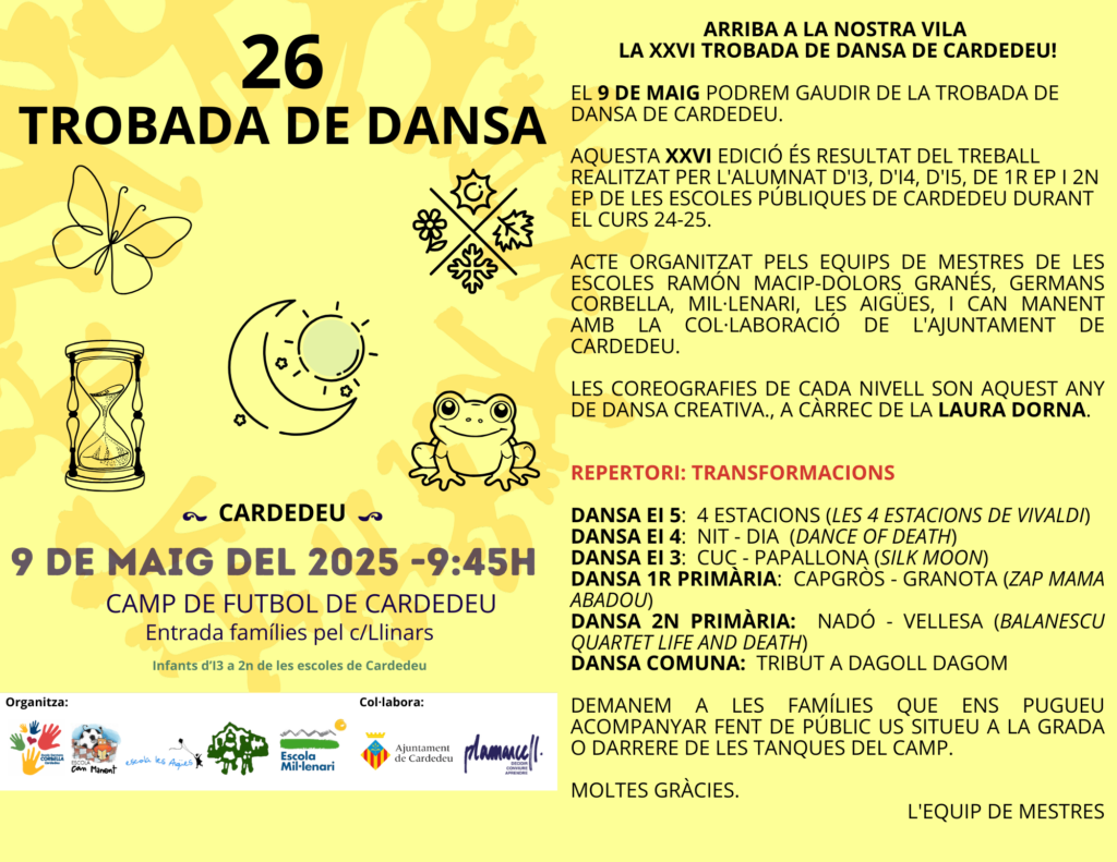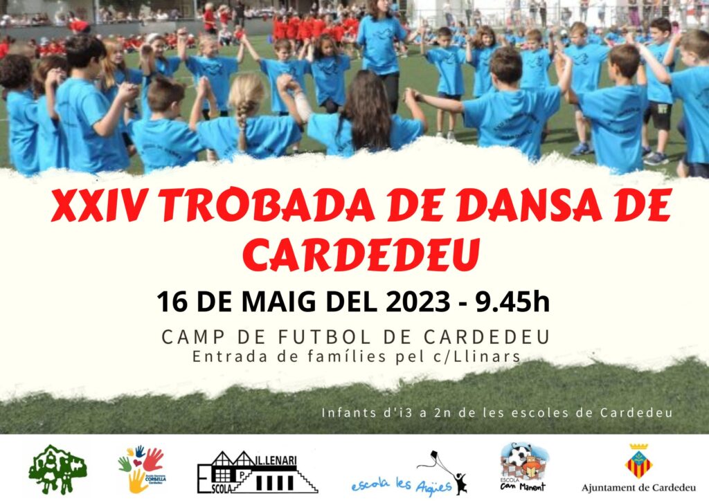 Benvolgudes famílies d’educació infantil i cicle inicial, Ens plau convidar-vos a la XXIV Trobada de dansa de Cardedeu, que serà el proper dimarts 16 de maig a les 9:45h, al camp de futbol de Cardedeu. L’entrada al camp de futbol per part de les famílies que vulguin assistir a l’acte es farà a partir de les 9’30