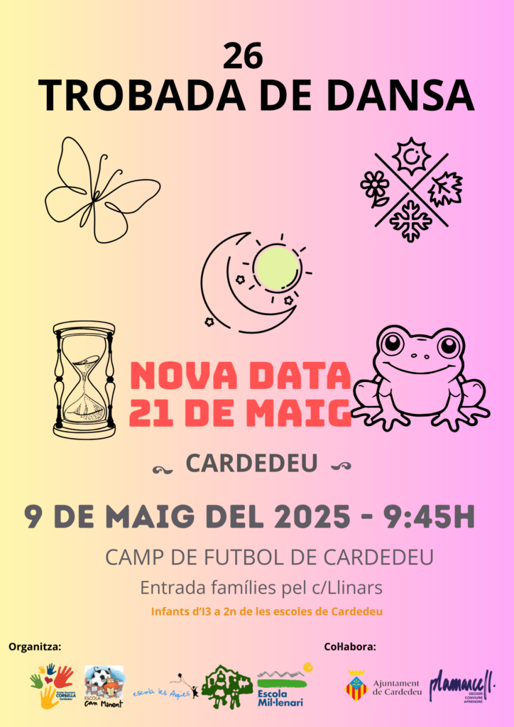 Benvolgudes famílies d’ I3,I4,I5,1r i 2n, Ens sap molt comunicar-vos que degut a l’alta probabilitat de pluja que es preveu aquest divendres 9 de maig al matí, hem decidit posposar la ballada. La nova data per celebrar la XXVI Trobada de dansa de Cardedeu serà el pròxim 21 de maig de 2025.