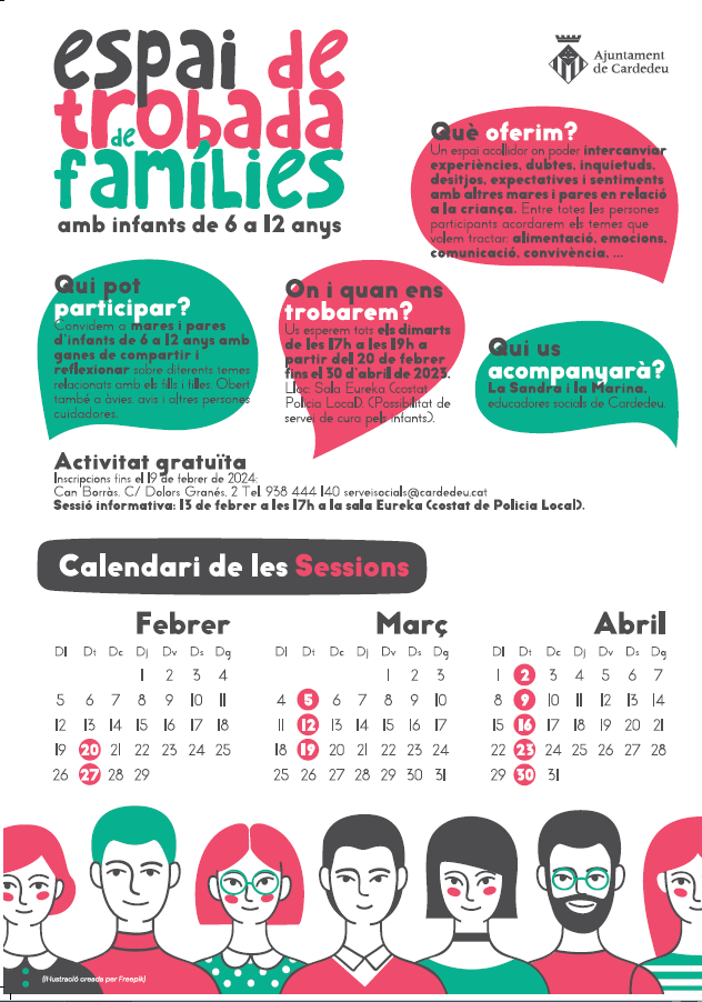 Benvolgudes famílies, Aquest mes de febrer s’iniciarà una nova edició de l’espai de trobada de famílies. Es tracta d’un espai on compartir i reflexionar sobre diferents qüestions relacionades amb la criança i, també, d’intercanvi d’experiències i de resolució de dubtes i d’inquietuds. L’activitat es farà a la Sala Eureka (al costat de la Policia Local) […]