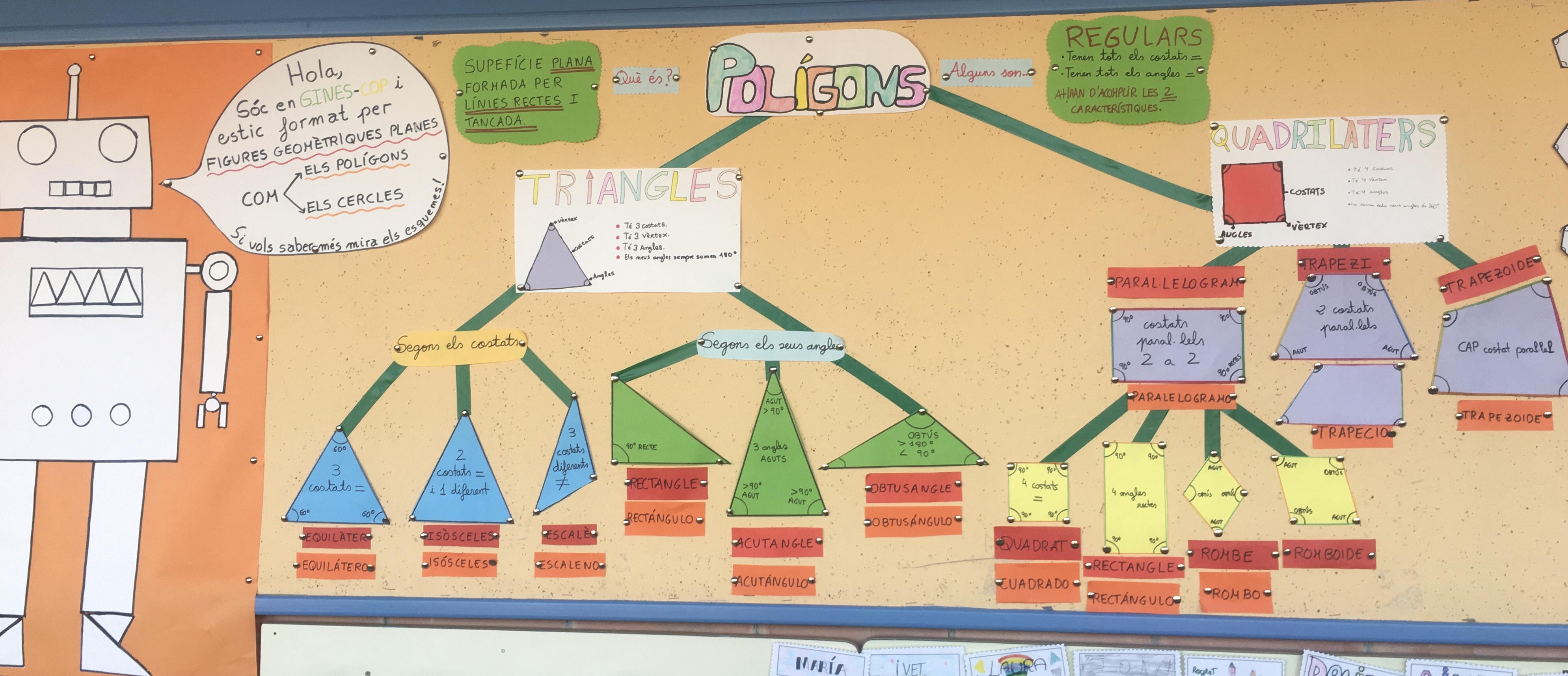 Sobre els polígons hem repassat la seva classificació, les seves parts, com s’anomenen, com són els seus angles i, finalment, hem elaborat un petit mural que hem posat a la cartellera de la classe.
