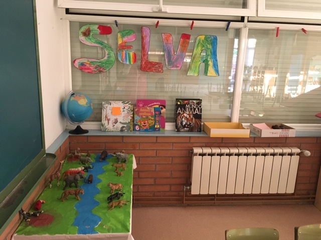 També han fet el mini-món de la selva, o com ells/es l’anomenen la petita selva, on entre tots hem decidit com fer-ho i pintar-ho i també on col·locar els animals de la selva, els ha servit per saber quins animals formen part de la selva i quins no.