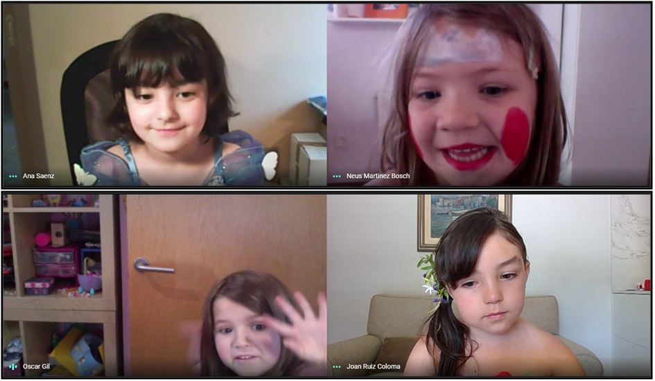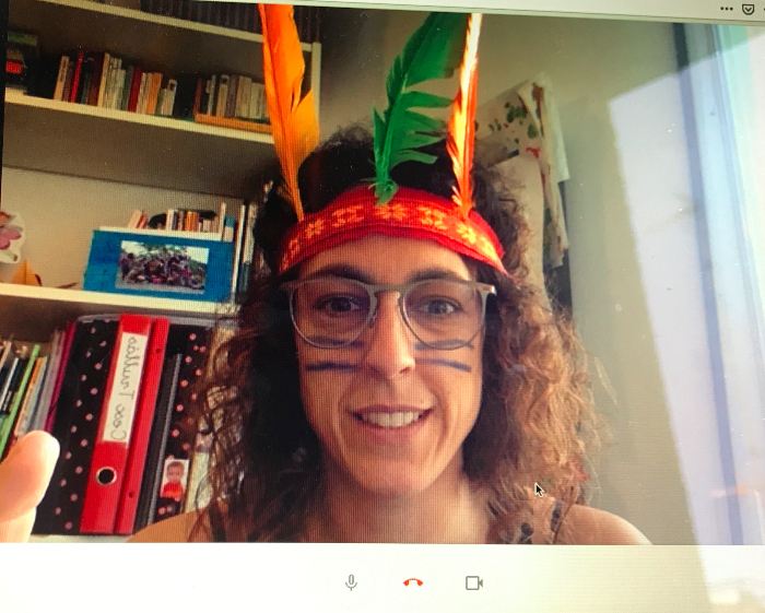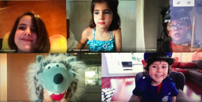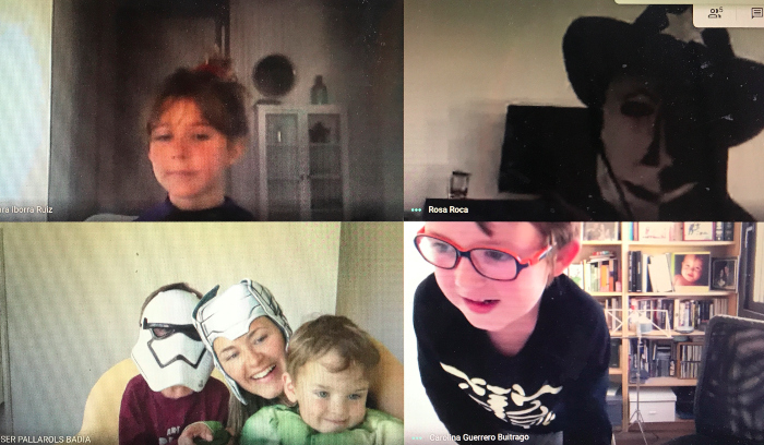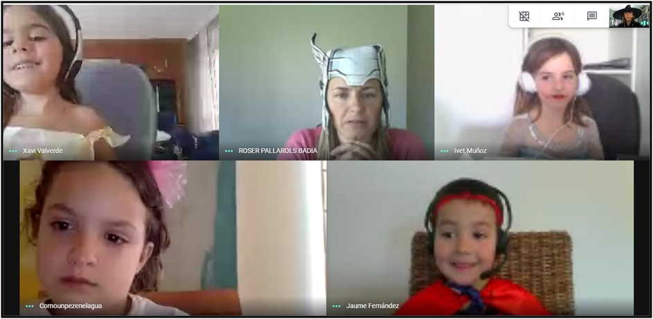 Aquesta setmana, els nens i les nenes de la classe de l’Arc de sant Martí, els nens i les nenes de la classe de les Guineus i les mestres, hem fet unes trobades diferents. Ens hem connectat disfressades i disfressats!