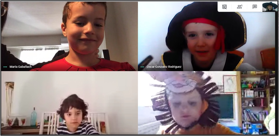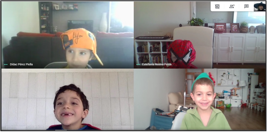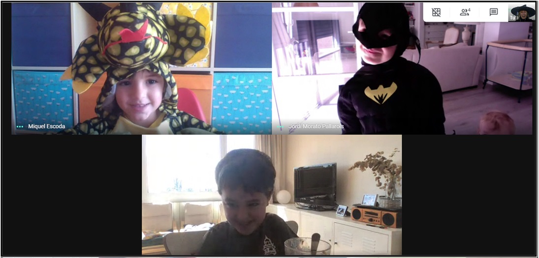 Aquesta setmana, els nens i les nenes de la classe de l’Arc de sant Martí, els nens i les nenes de la classe de les Guineus i les mestres, hem fet unes trobades diferents. Ens hem connectat disfressades i disfressats!
