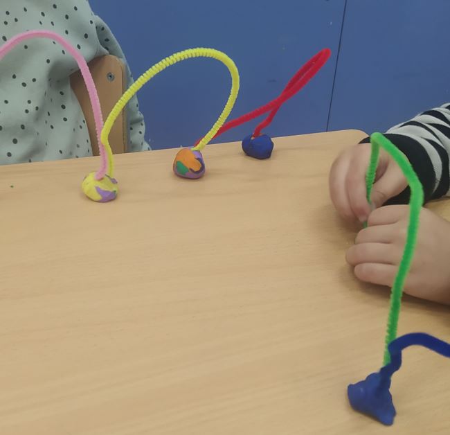 Els infants d’I4 gaudim molt fent racons, en aquest cas són per treballar la motricitat fina, enfilant peces, fent escultures amb plastilina i neteja pipes o fent traços amb retoladors…