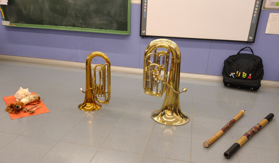 Benvinguts i benvingudes al món de la Tuba! En Toni Chelvi, músic professional de la banda municipal de Barcelona, ens ha vingut a fer una audició perquè coneguéssim i aprenguéssim més coses sobre la Tuba i la seva família d’instruments antics. Ha estat a través d’un conte que ens ha anat explicant la història i