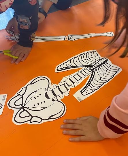 A l’àrea de medi seguim treballant l’esquelet humà, és per això que hem aprofitat la sessió de plàstica d’aquesta setmana per a realitzar un gran treball plàstic, on a partir d’una silueta real d’un company de l’aula hem construït un esquelet a mida real.