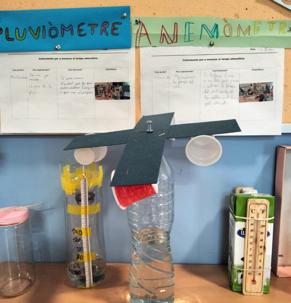 A la classe de 4t hem construït diversos objectes que ens serveixen per mesurar diferents elements del temps atmosfèric. Un pluviòmetre que es fa servir per recollir aigua de la pluja, un baròmetre que serveix per mesurar la pressió de l’aire, un penell que serveix per saber la direcció del vent, un anemòmetre que s’empra