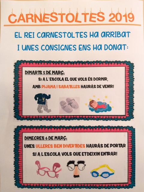 Un cop al pati, ha arribat la comitiva del Rei Carnestoltes amb tots els Reis i Reines dels bojos. Ens han llegit els Greuges i han donat per inaugurat el dia d’avui! Les consignes boges que ens han donat per dimarts i dimecres que ve són:
