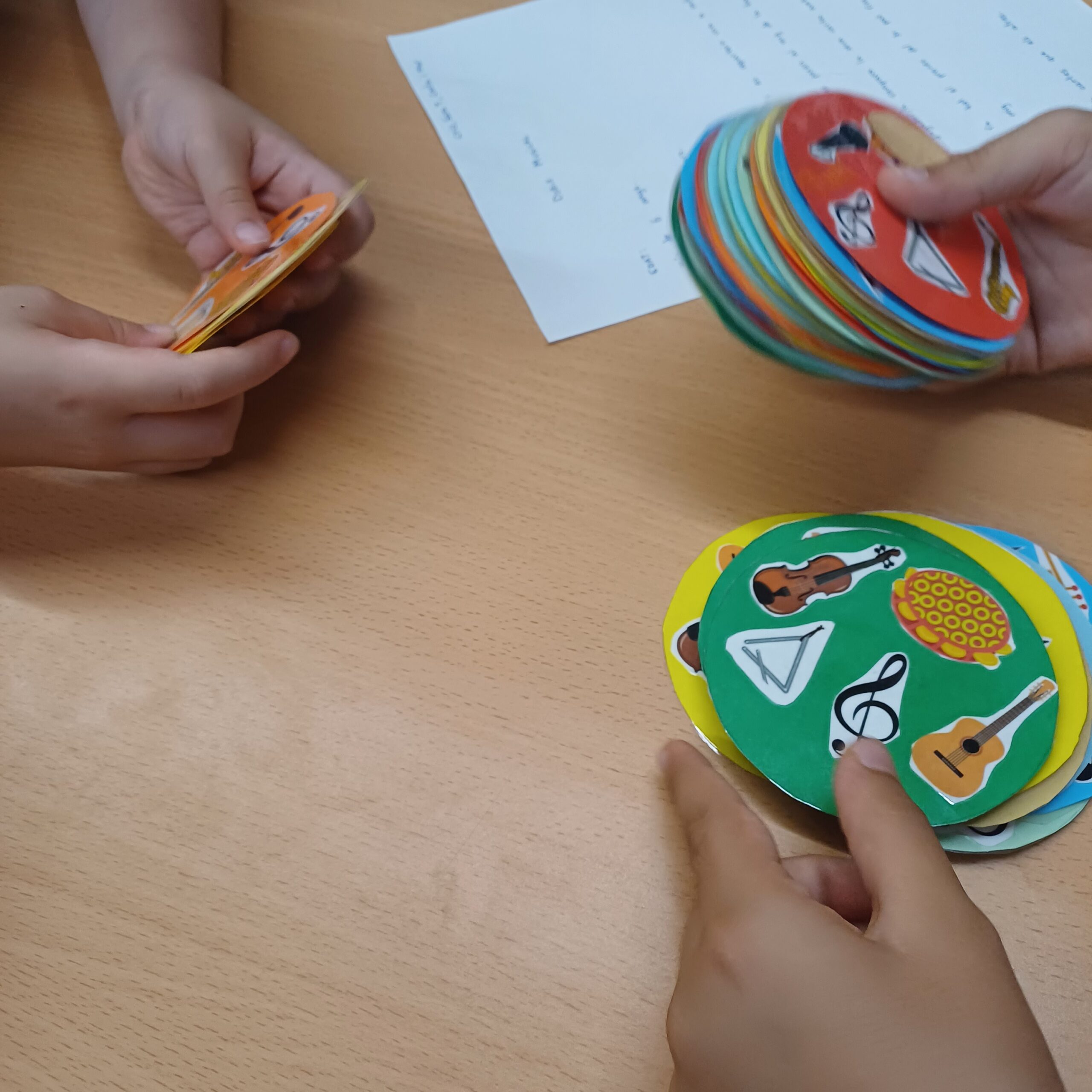 Els nois i noies de sisè han pensat, dissenyat i assajat diversos jocs rítmics, melòdics… per compartir-los amb companys i companyes de 1r i 3r. A través d’aquesta iniciativa, han tingut l’oportunitat d’adoptar un rol actiu com a protagonistes de l’aprenentatge, assumint la responsabilitat de guiar, explicar i dinamitzar les activitats amb els més petits.