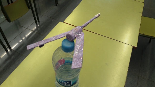 Hem clavat un escuradents a un tap de suro enganxat a una ampolla, també  hem travat dues forquilles i hem afegit un escuradents entre les forquilles. Després  ho hem posat sobre l’altre escuradents. I ho hem aconseguit!