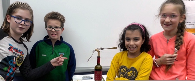 Aleshores vam pensar en canviar l’experiment de l’equilibri. Vam buscar idees i les vam posar en comú. Ens vam decidir a fer l’equilibri amb una ampolla, un tap de suro, dues forquilles, un escuradents i una moneda. Ens va costar força i ens vam adonar que la moneda de 20 cèntims tenia escletxes al seu voltant i costava molt que s’aguantés. Amb una moneda d’euro tenim equilibri.