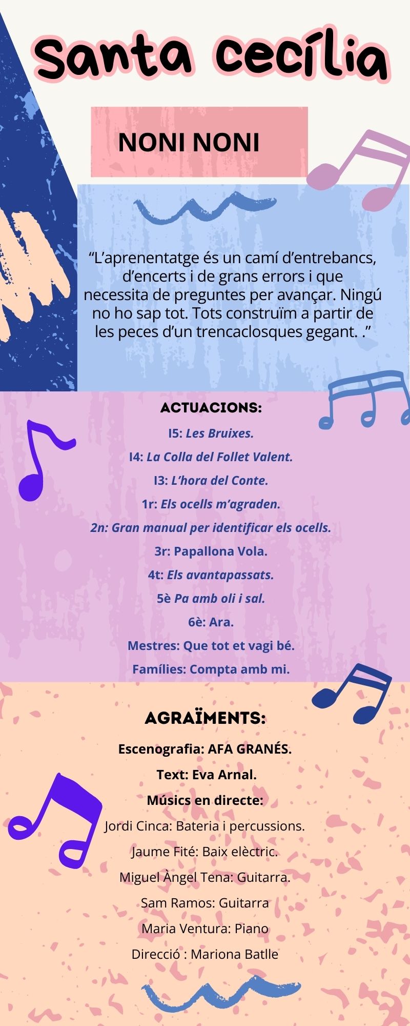 Santa Cecília és una de les festes més representatives de la nostra escola, tota la comunitat participa d’alguna manera a l’espectacle fent que sigui un dia ben especial.