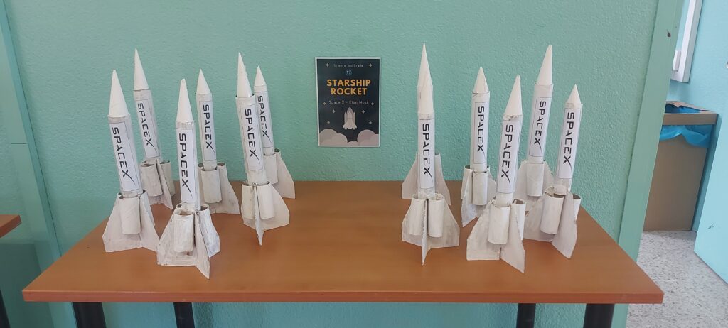 To finish our Field trip to space project, we have decided to make a rocket in teams with the collaboration of some volunteer families. We have used some recycled materials such as the kitchen or toilet paper rolls, and we have learned a lot of English vocabulary about Arts and Crafts. We had so much fun today!