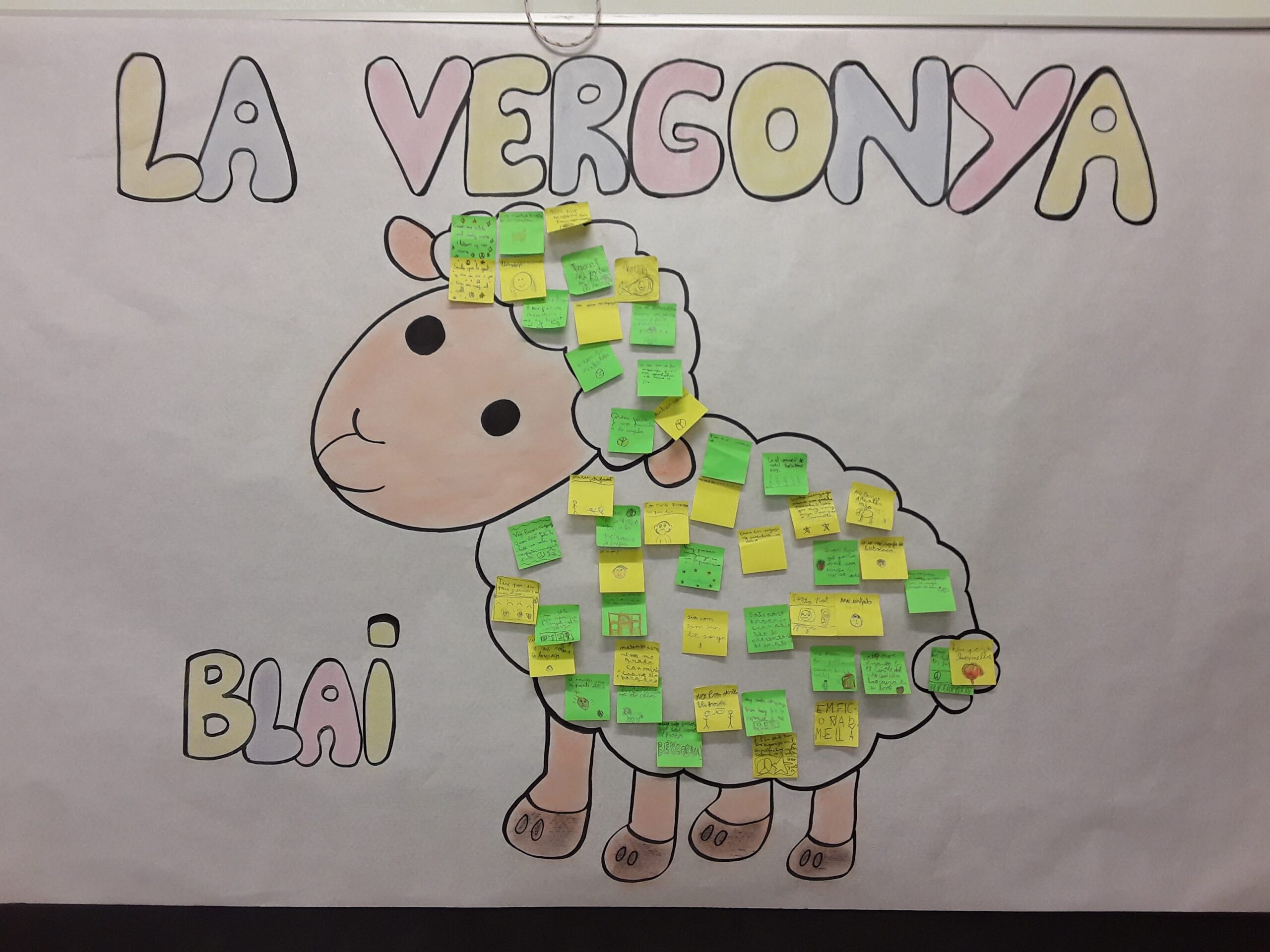 Els alumnes de 3r hem estat treballant a valors l’emoció de la vergonya a partir d’un conte anomenat Blai, el petit xai. Primer de tot hem escoltat atentament el conte i, un cop acabat, l’hem comentat i hem identificat l’emoció de què es tractava. Llavors, individualment, hem apuntat en un post-it verd algun moment en què hem sentit vergonya i, en un de groc, el que ens passa quan sentim vergonya. Finalment, hem anat sortint a la pissarra per enganxar els paperets damunt el dibuix d’en Blai i, si ens venia de gust, ho explicàvem i compartíem amb la resta de la classe. Què bé ens ha anat parlar d’aquesta emoció!