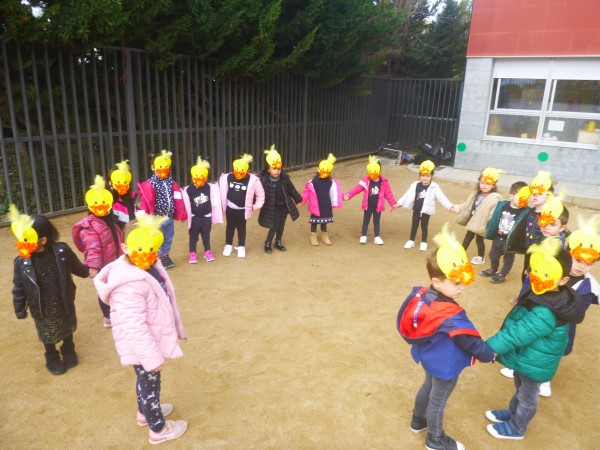Els divendres, vam fer una festa de carnaval per cicles. Els nens i les nenes d’educació infantil anaven disfressats del nom de la seva classe: aneguets, pollets, taurons, pingüins, coales i guepards. Mireu que bé s’ho van passar!!!!
