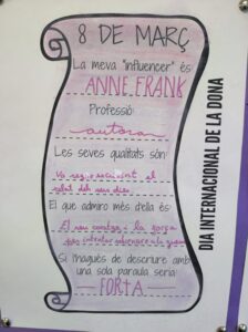El dia 8 de març a l’escola han fet activitats relacionades amb el dia internacional de les dones. A cicle superior, els nens i les nenes han fet un debat sobre el paper de la dona al llarg de la història i han elaborat un pergamí amb una referent femenina.