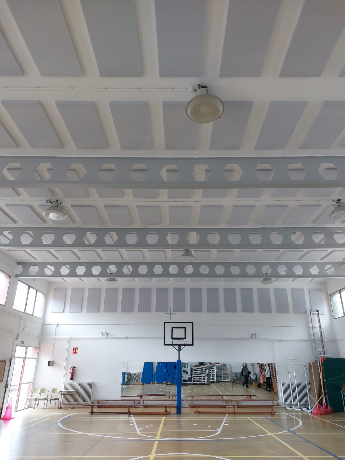 Hem  insonoritzat el gimnàs de l’escola col·locant uns panells al sostre i en una paret lateral. D’aquesta manera hem millorat l’acústica d’aquest espai i ja no hi ha reverberacions. El gimnàs és un espai polivalent a on podrem fer concerts, reunions, concerts, obres de teatre…