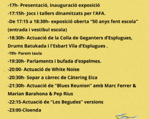 El punt àlgid de la celebració tindrà lloc el dia 13 de juny, unes hores plenes  d’activitats per a tots els públics. Tindrem tallers infantils dinamitzats per l’AFA, la inauguració de l’exposició “50 anys fent escola”, actuació de la colla de Gegants d’Esplugues, de Drums batukada i de l’Esbart Vila d’Esplugues, farem alguns parlaments i el sopar on hi podrà accedir tot aquell que tingui tiquet, acabarem amb actuacions musicals de White Noise, Blues Reunion i Les Begudes (grup de versions).