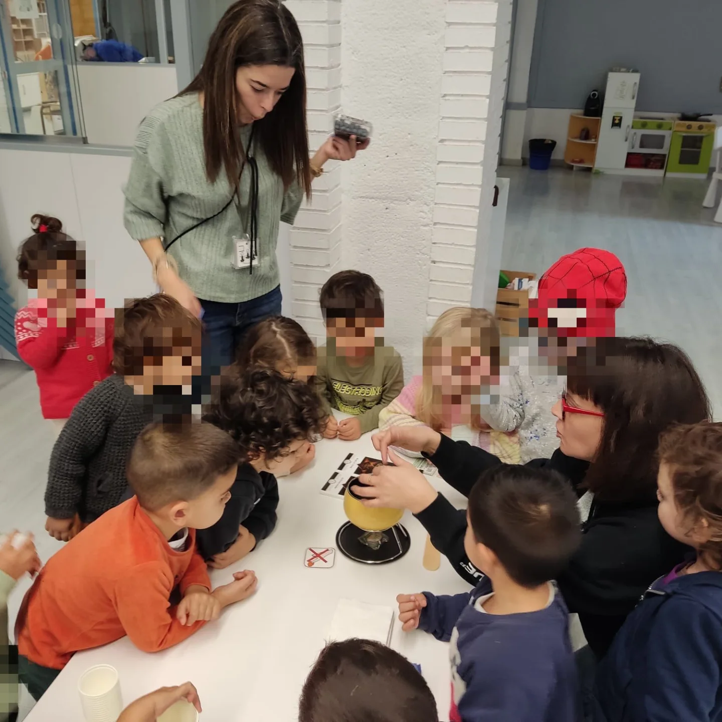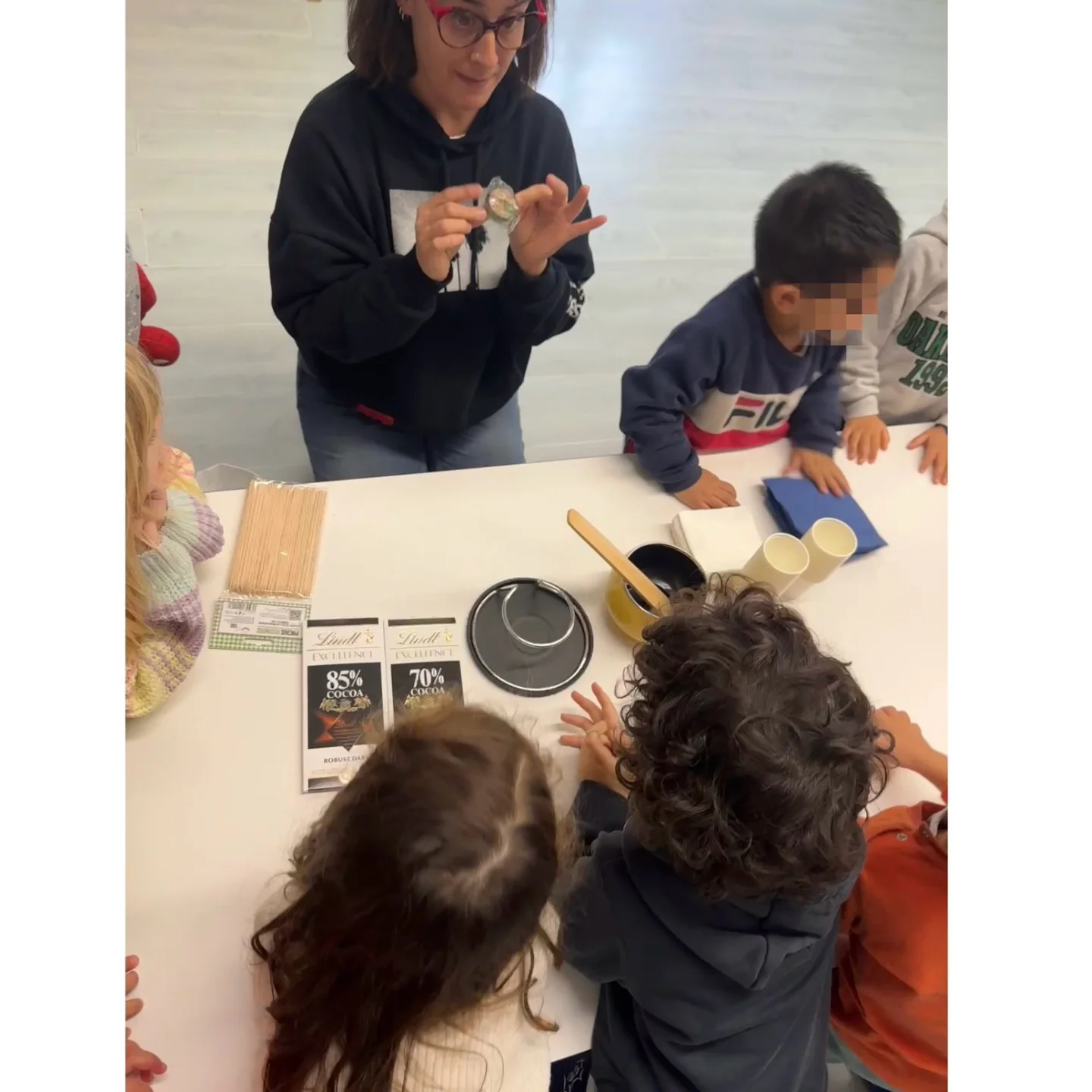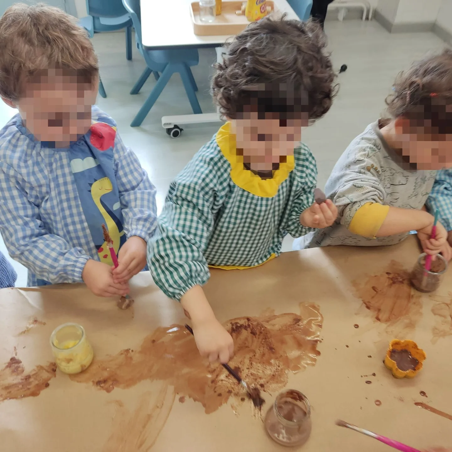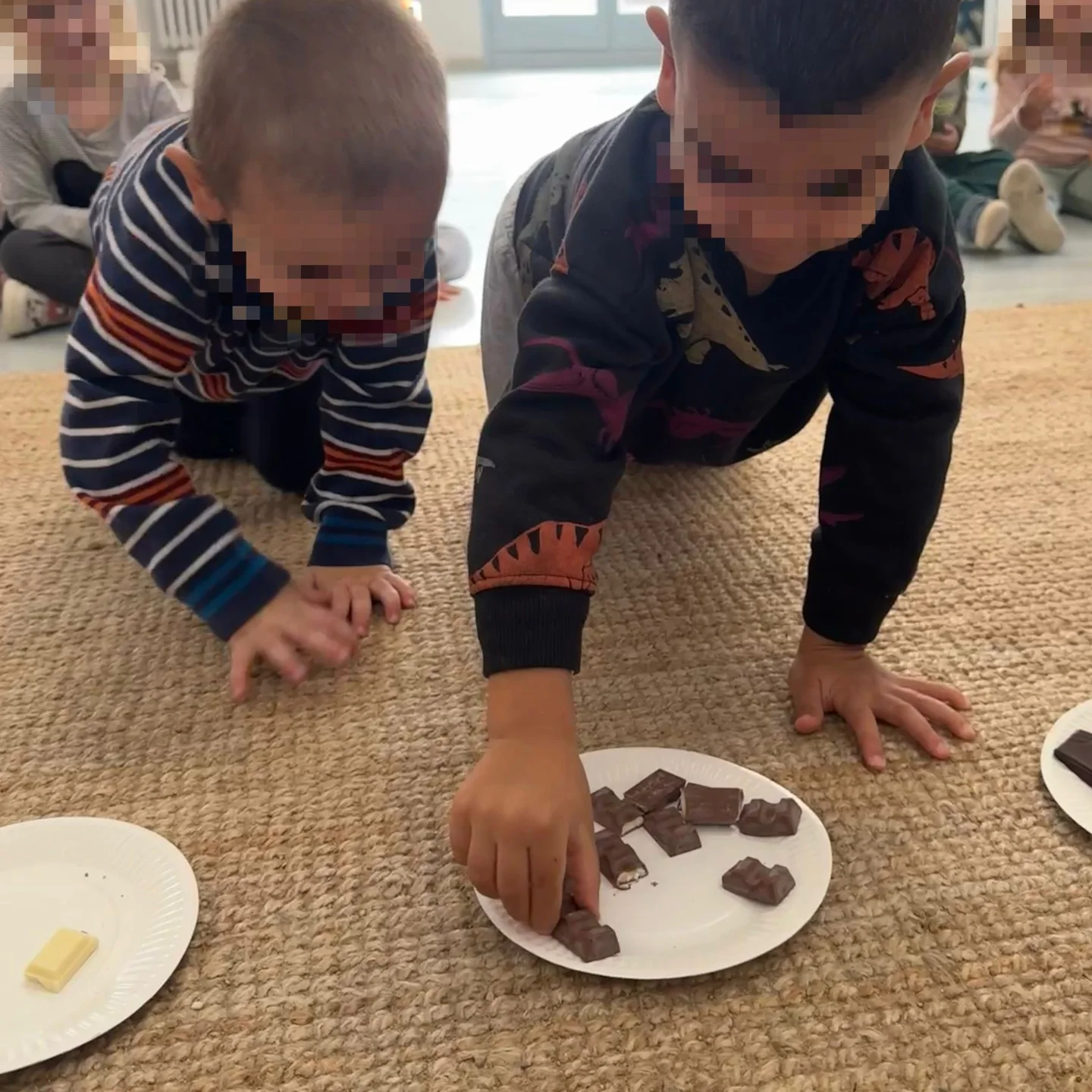 A i3 hem experimentat amb els diferents sentits a partir de la xocolata. 🍫 Amb la vista 👁️ hem pogut veure els diferents productes, formes i colors (que hi ha de diferents tonalitats i hem trobat semblances amb els diversos colors de la pell), amb el tacte 🤏🏻 hem notat els estats i la temperatura, amb l’olfacte 👃🏼 la seva olor, comparant-la amb altres, i amb el gust 👅 hem fet un tastet deliciós descobrint els diferents tipus de xocolata i veient que n’hi ha de dolces i d’altres que porten menys sucre. Fins i tot amb l’oïda 👂🏼 podem diferenciar si una xocolata sona com una rajola o desfeta! A més, hem despertat tots aquests sentits fent d’artistes pintant amb xocolata! 👩🏼‍🎨🧑🏽‍🎨