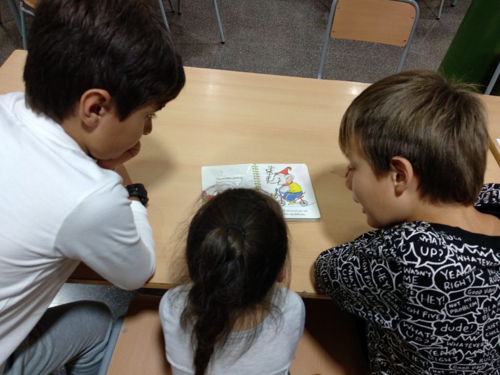 Apadrinem als alumnes de P5. Cada nen o nena de quart té un fillol/a. Alguns nens o nenes van a la biblioteca, uns altres a informàtica i la resta es queden jugant a la classe de P5.