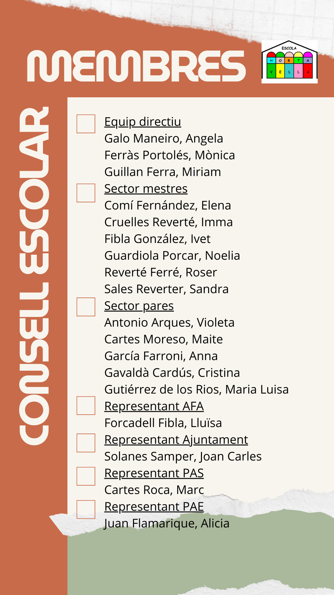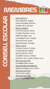 El consell escolar del centre és l’òrgan col·legiat de participació de la comunitat escolar en el govern del centre. En el consell escolar hi ha representats tots els col·lectius que intervenen en la comunitat educativa: director, professorat, alumnat, personal d’administració i serveis, etc.