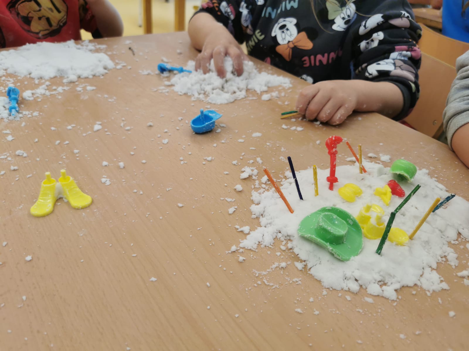 Fa uns dies i aprofitant que encara estem a l’hivern, la classe dels dracs vam crear neu mesclant bicarbonat i aigua. Llavors, vam aprofitar per manipular, experimentar i jugar desenvolupant la nostra creativitat. Vam fer boletes, crear ninots de neu, els vam decorar amb diferents materials per vestir als ninots. Ens ho vam passar molt bé!
