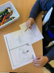 A cicle inicial, l’alumnat de 1r va treballar el poema a partir de la lectura i la còpia d’un fragment, i posteriorment van fer un dibuix relacionat amb el que els suggeria el poema, combinant així expressió escrita i expressió artística.