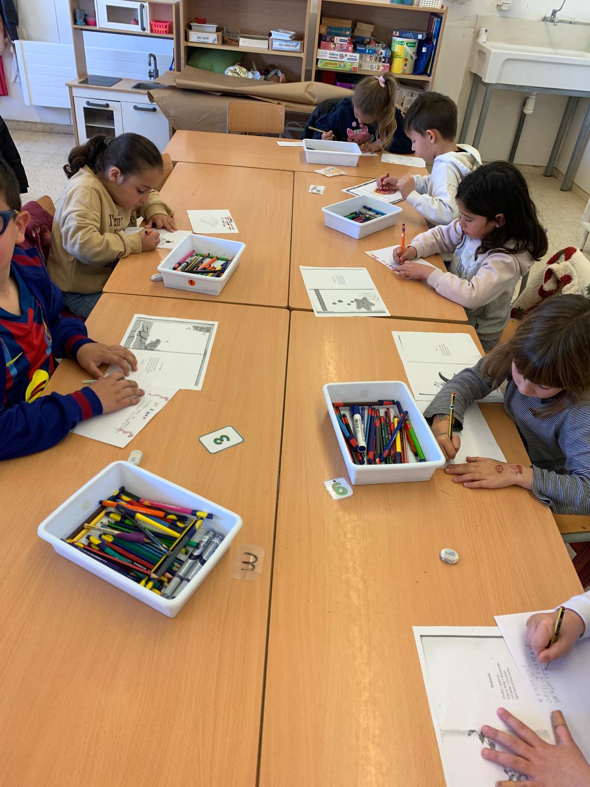 A cicle inicial, l’alumnat de 1r va treballar el poema a partir de la lectura i la còpia d’un fragment, i posteriorment van fer un dibuix relacionat amb el que els suggeria el poema, combinant així expressió escrita i expressió artística.
