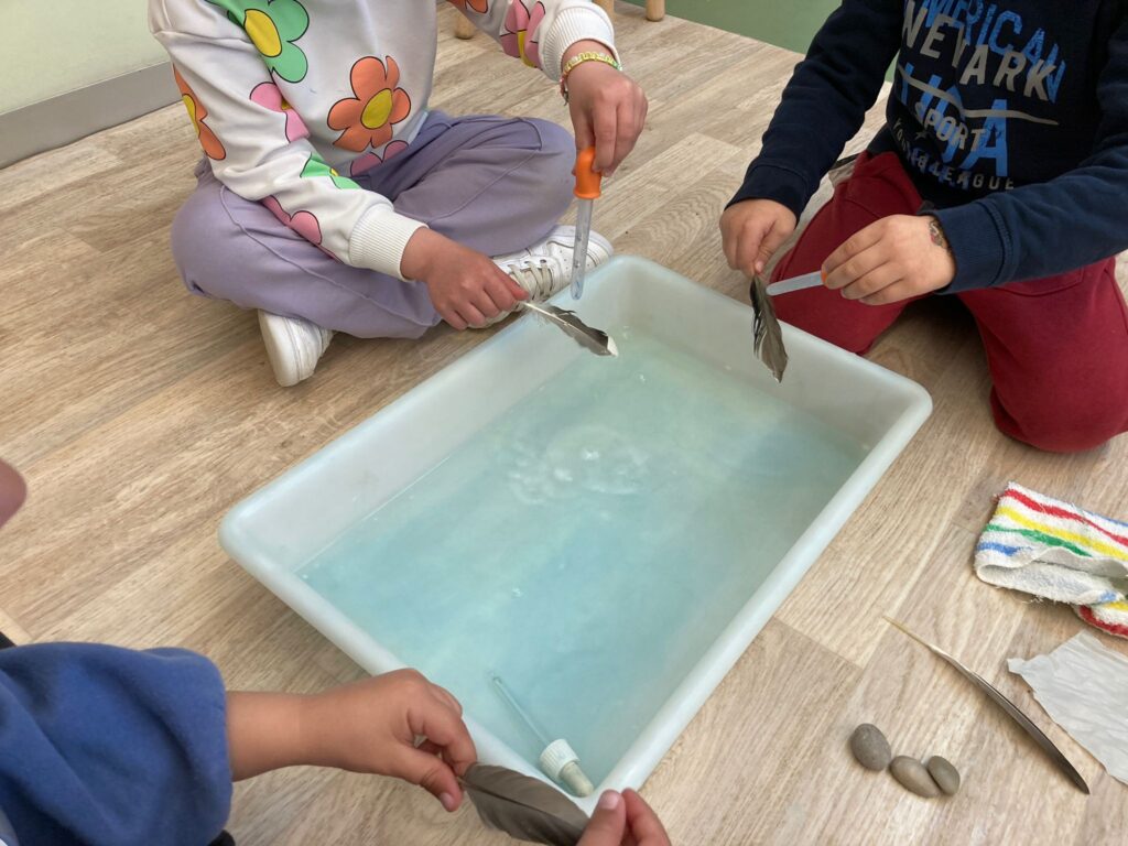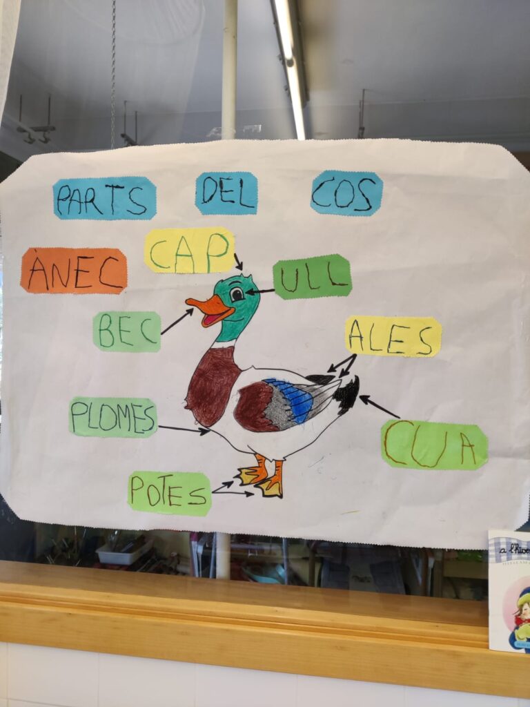 En una altra sessió van fer un experiment posant aigua en pipetes i deixant caure unes gotes a sobre de diferents materials (suro, plàstic, roba, paper, plomes d’ànec, pedretes,…), en acabar l’experiment van classificar els materials en si es mullen o no es mullen, perquè aquests últims són impermeables. També van fer un mural entre tots on van escriure per parelles una paraula de les parts de l’ànec.