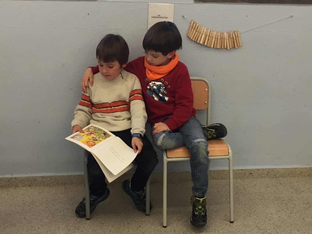 Cada dia, dintre del nostre horari, tenim franjes de mitja hora on ens dediquem a llegir. A vegades la lectura és guiada, d’altres com en el cas d’aquestes fotografies, lliure. Triem un llibre de la nostra biblioteca d’aula i al nostre ritme anem llegint, sols o acompanyats. A més de millorar el procés lector el