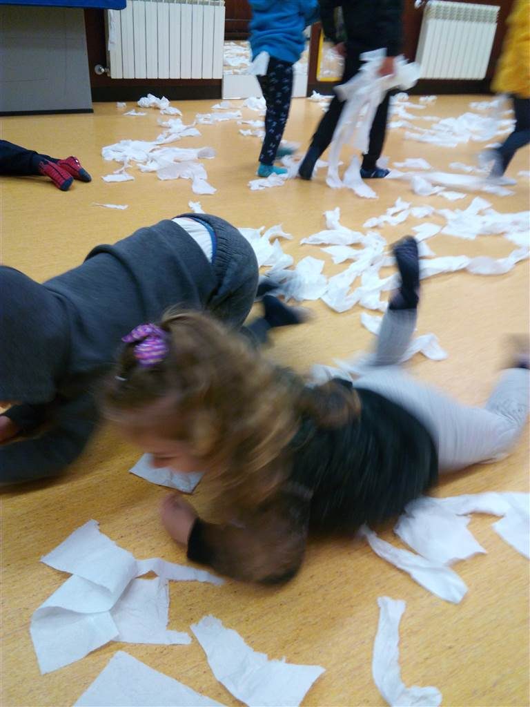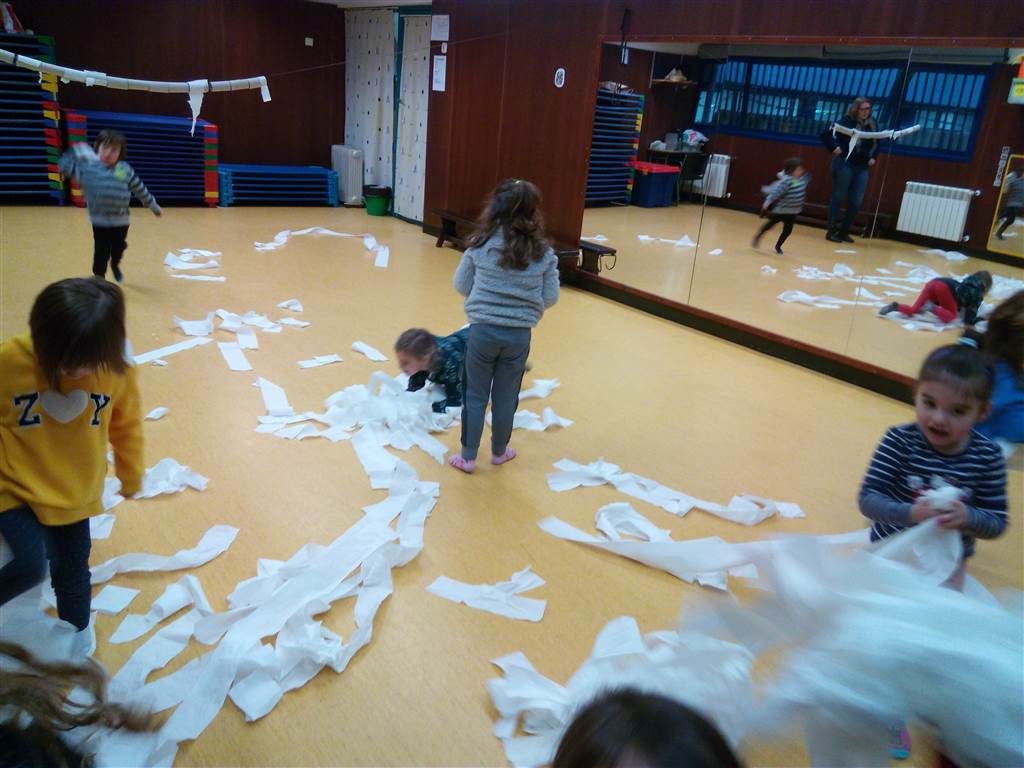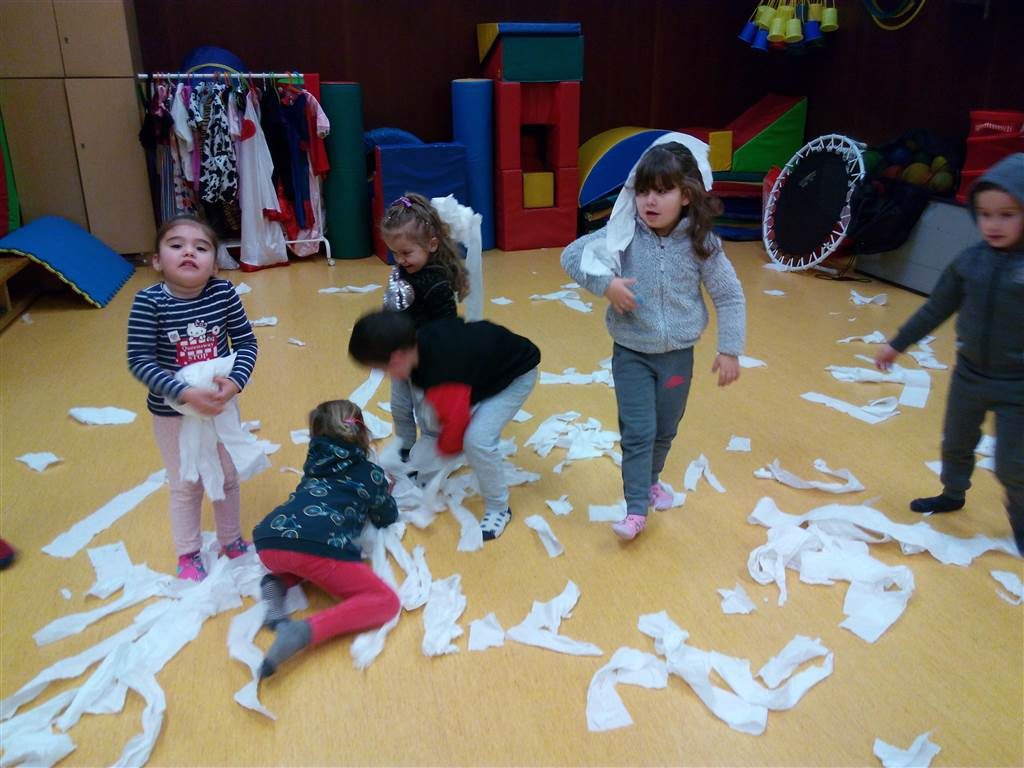 Aquest matí hem anat a la classe de psicomotricitat i ens hem trobat una sorpresa. Ens hem trobat tot de papers higiènics preparats per simular la neu, dins la setmana de pluges i neu que hem patit. Hem estirat el paper, hem fet boles de neu i ens les hem tirat per sobre, hem fet ninots de neu, ens hem tirat pel trineu…ens ho hem passat molt bé.